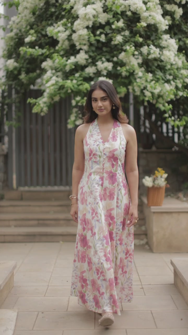 Step into a fairytail with our cherry blossom dress. adorned with soft pastel florals in shades of blush pink, lilac and cream. its has a flattering fitted bodice and a graceful flare that flows with each step!
