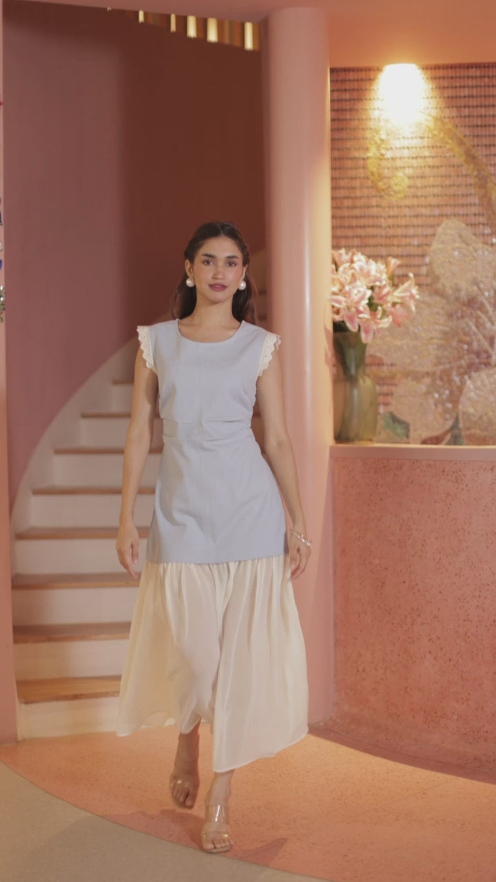 Summery, charming and soft vibes! the Luna breeze is  with baby blue bodice, delicate frill cap sleeves, a flattering waist seam and flowy frills making it perfect fit got chic evenings and brunches