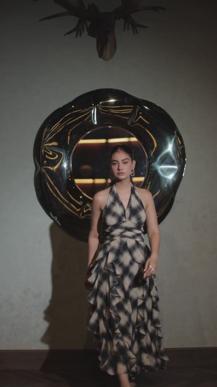 Turn heads in our midnight glamour halter dress. a perfect blend of playfulness and femininity. crafted from premium fabrics with a unique tie-dye pattern. it has a halter neck that ties at the back giving an effortless chic look. the layered ruffles adds grace & volume to the silhouette!