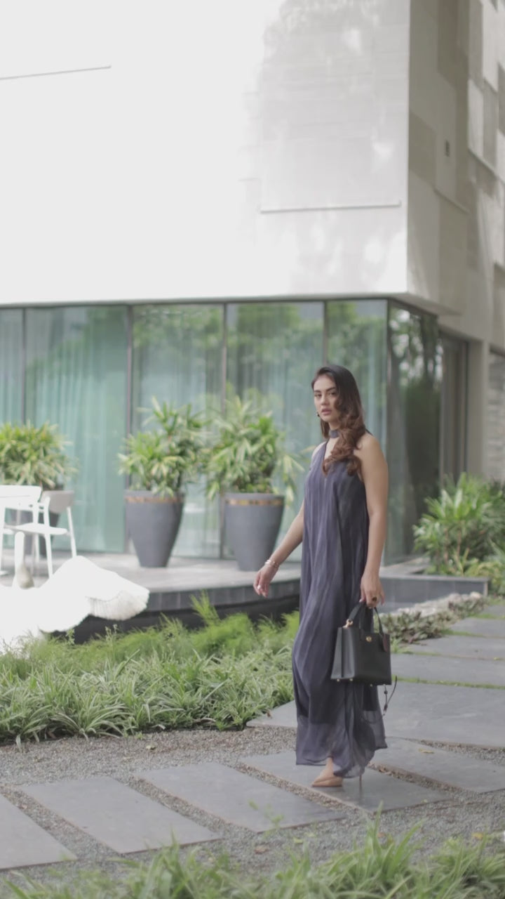 Make a statement in the silken waterfall maxi dress where elegance meets ease . it has a dreamy blend of charcoal &slate hues and is flowy, giving that effortless glamour. the halter neckline has an attached choker strap making it a mix of bold & beautiful!